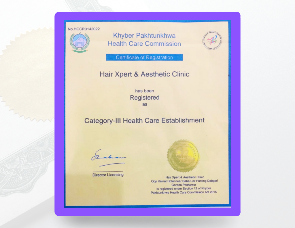Hair Xpert Clinic is officially licensed and registered by the Khyber Pakhtunkhwa Health Care Commission. We operate as a Category-III Health Care Establishment under Section 12 of the KP-HCC Act 2015. This certification proves our commitment to safe, ethical, and compliant medical practices. We meet all provincial standards for hygiene, equipment, doctor qualification, and patient safety. This recognition reflects the trust patients place in us, across Peshawar, Quetta, and beyond. Every procedure is backed by clinical training, regulatory oversight, and years of successful outcomes. You’re not just choosing a clinic. You’re choosing a licensed medical establishment with a duty to deliver excellence.